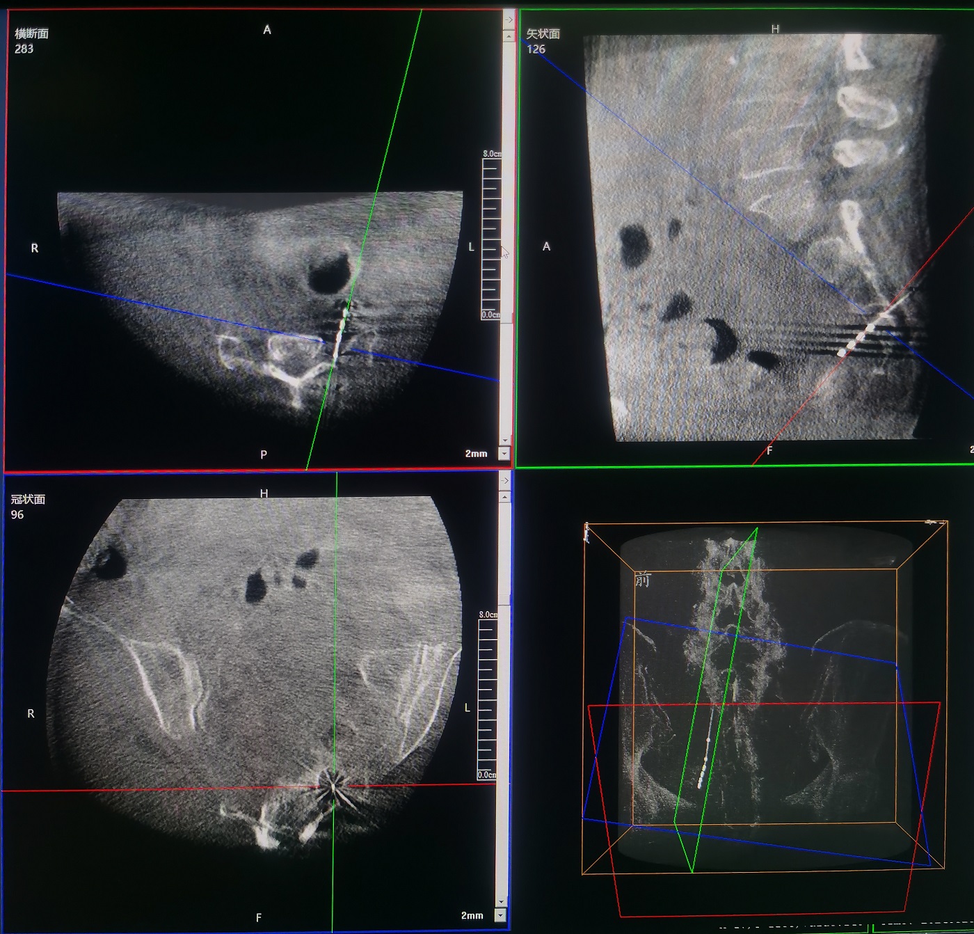 術中,運用普愛醫(yī)療三維C形臂環(huán)掃,采集骶骨區(qū)域三維圖像,在機器人導航界面上進行路徑規(guī)劃,自動引導進入骶3神經(jīng)孔。