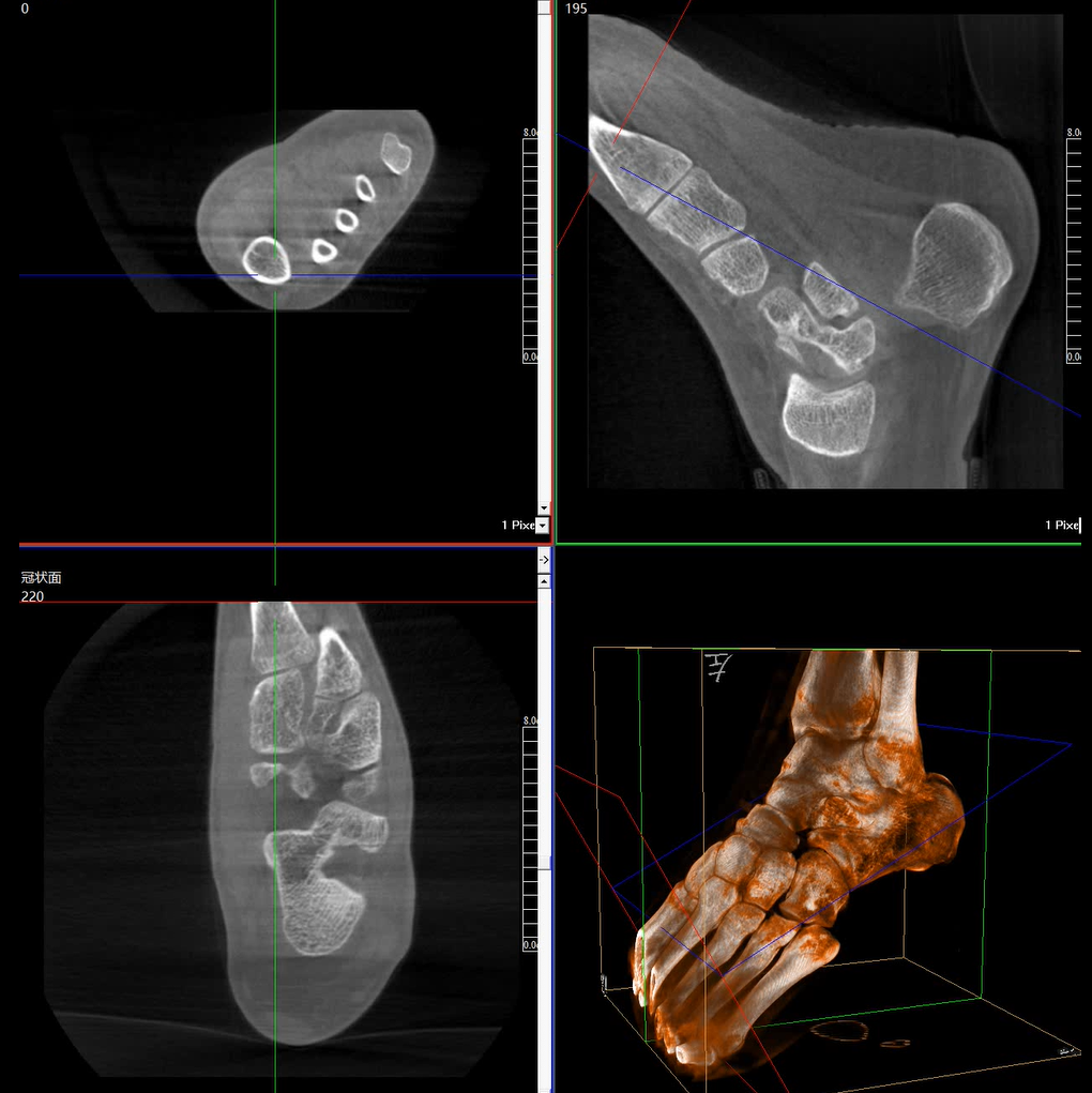 術(shù)中三維成像和橫斷面圖像提供多角度的手術(shù)診斷信息,輔助醫(yī)生進行術(shù)中評估判斷,諸如骨折復位情況和內(nèi)植入螺釘?shù)某叽绾臀恢茫o助手術(shù)更好地完成。