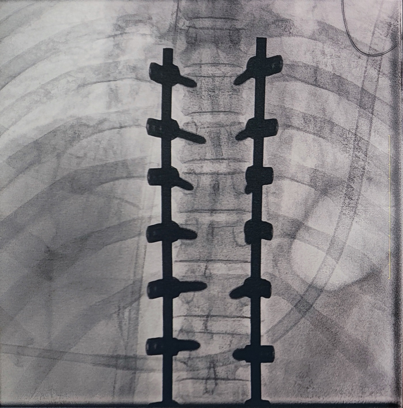 一場(chǎng)脊柱手術(shù)中,醫(yī)生需要拍攝跨越7個(gè)節(jié)段的脊柱影像,由于曝光的視野較大,常規(guī)視野的C形臂通常需要拍攝2-3次,普愛醫(yī)療大平板一體式C形臂30CM*30CM的“大視野”,輔助醫(yī)生一次性完成了7個(gè)節(jié)段的拍攝。最終,醫(yī)生在高清影像的輔助下完成了14枚螺釘?shù)木珳?zhǔn)定位、置入。