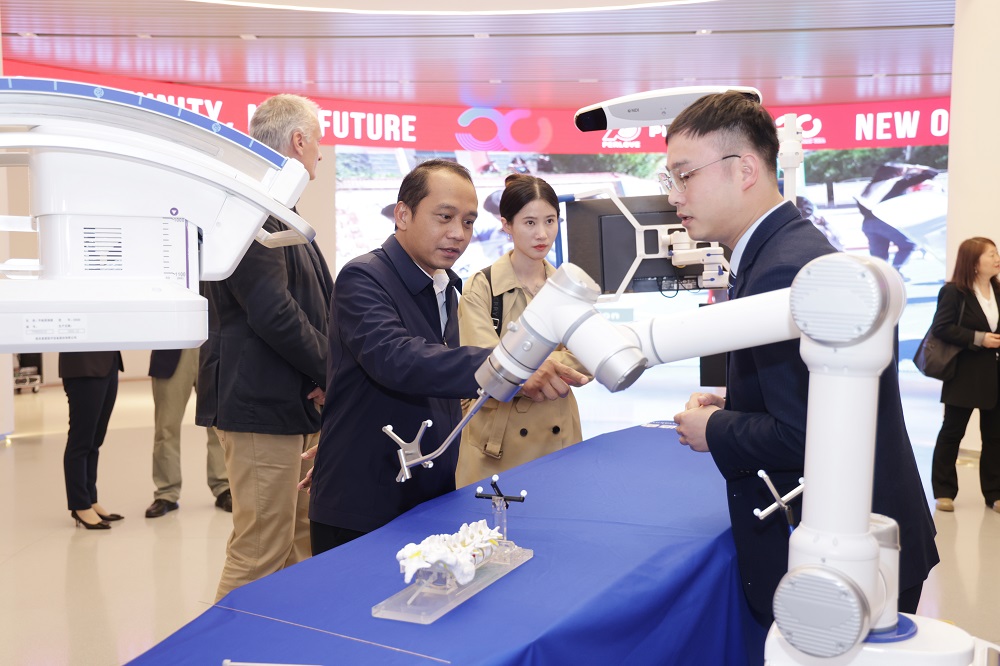 普愛醫(yī)療國際市場經(jīng)理陪同代表團參觀了公司多款創(chuàng)新產(chǎn)品,重點操作展示了“脊柱外科手術(shù)導(dǎo)航定位系統(tǒng)”。