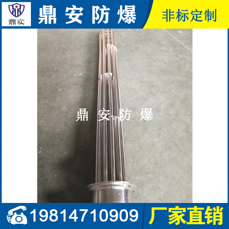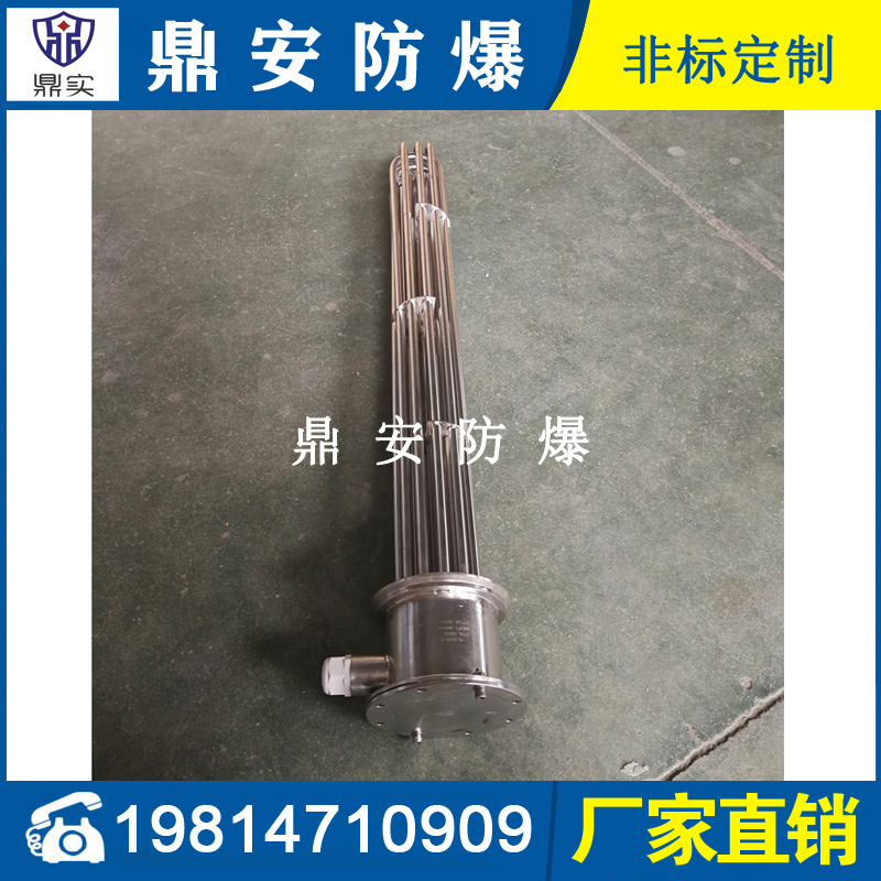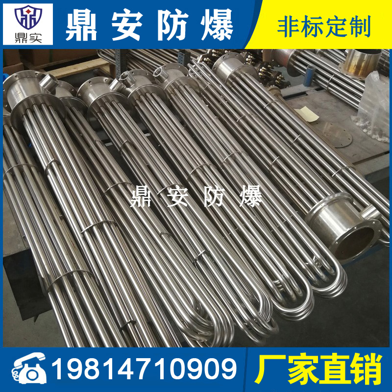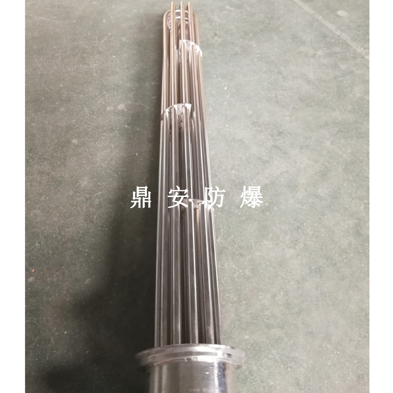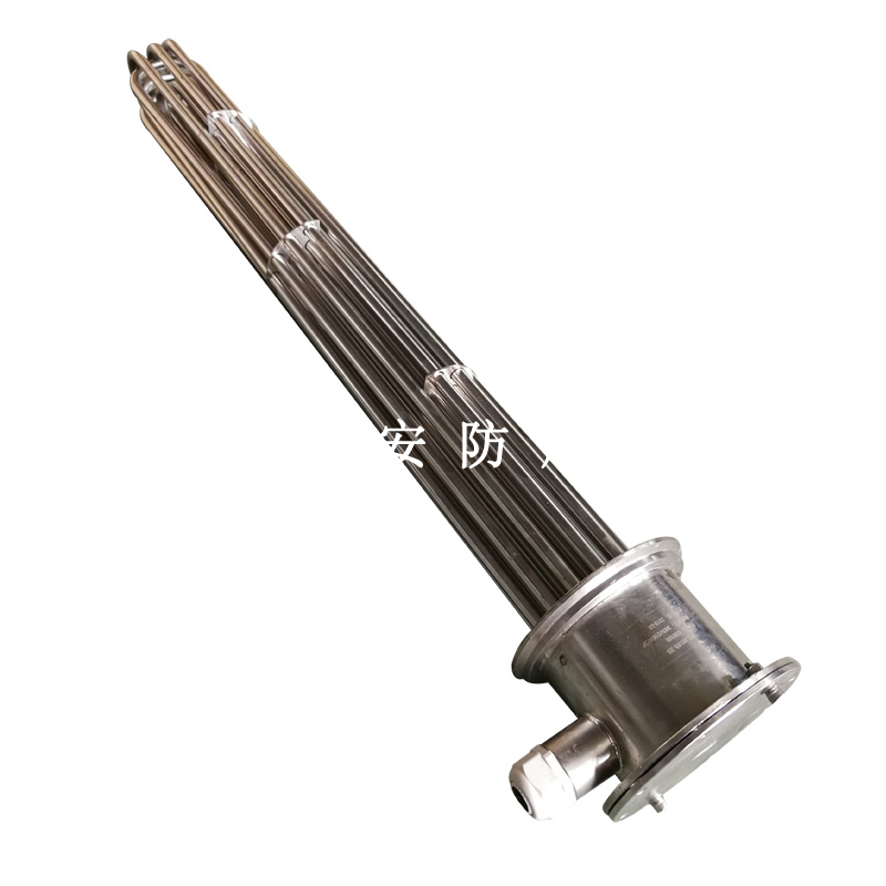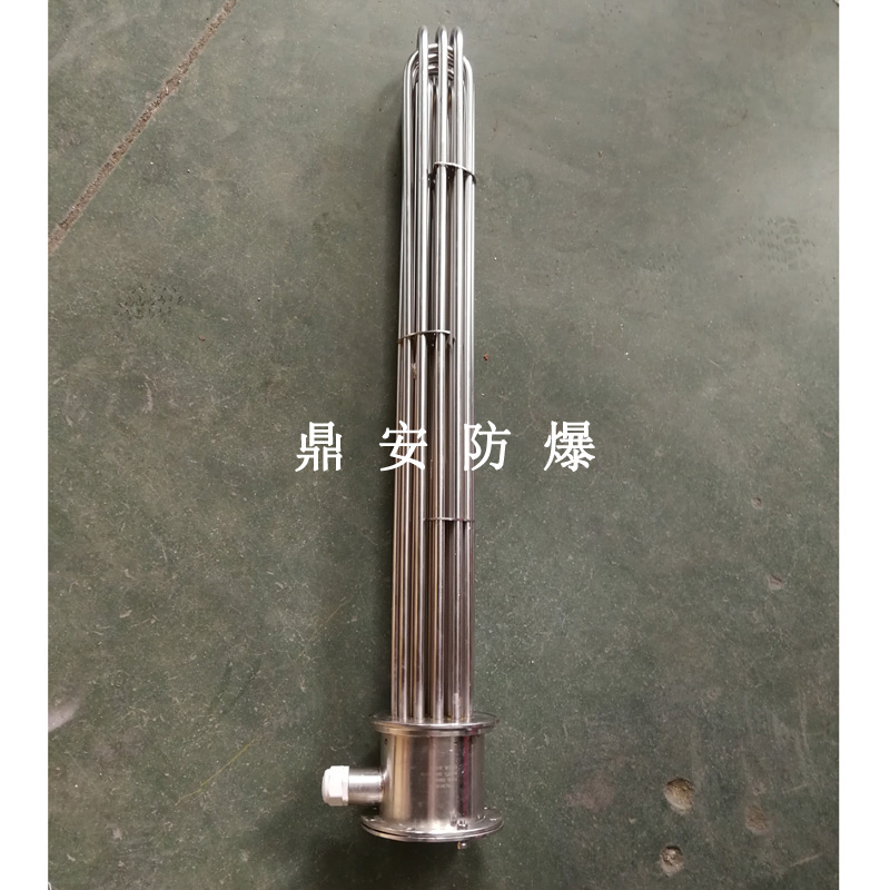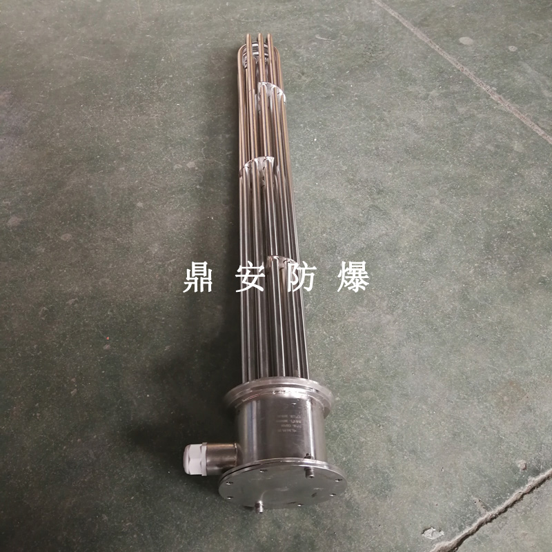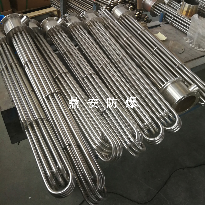 法蘭電熱管(也稱插入式電加熱器):是采用U型管狀電熱元件,多支U型電熱管焊接在法蘭上集中加熱,依據(jù)加熱不同介質(zhì)設(shè)計(jì)規(guī)范,按照功率配置要求裝配在法蘭蓋上,插入需加熱物料中,發(fā)熱元件工作時(shí)所發(fā)出的大量熱量傳導(dǎo)給被加熱介質(zhì)使介質(zhì)溫度升高,達(dá)到所需的工藝要求,主要用于敞開(kāi)式、封閉式的溶液箱和循環(huán)系統(tǒng)中加熱用。
