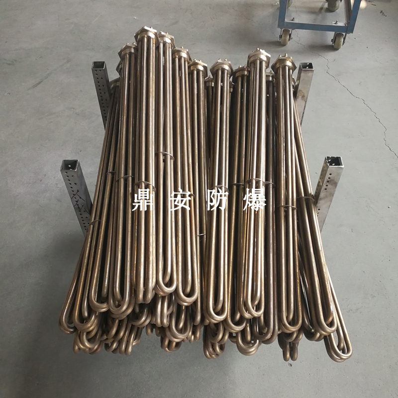 法蘭電熱管(也稱插入式電加熱器):是采用U型管狀電熱元件,多支U型電熱管焊接在法蘭上集中加熱,依據(jù)加熱不同介質(zhì)設(shè)計(jì)規(guī)范,按照功率配置要求裝配在法蘭蓋上,插入需加熱物料中,發(fā)熱元件工作時(shí)所發(fā)出的大量熱量傳導(dǎo)給被加熱介質(zhì)使介質(zhì)溫度升高,達(dá)到所需的工藝要求,主要用于敞開(kāi)式、封閉式的溶液箱和循環(huán)系統(tǒng)中加熱用。