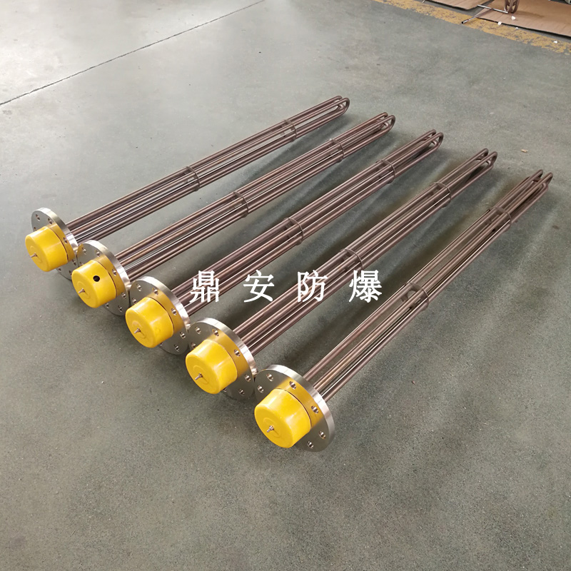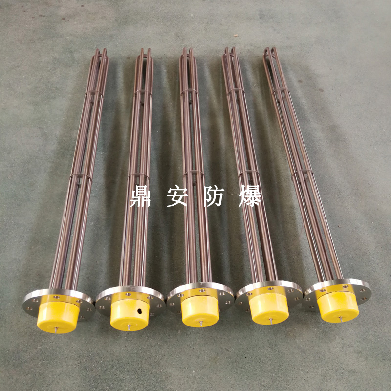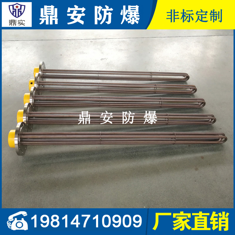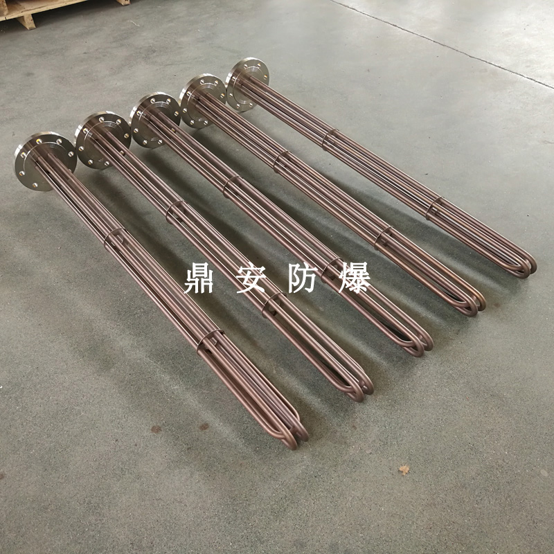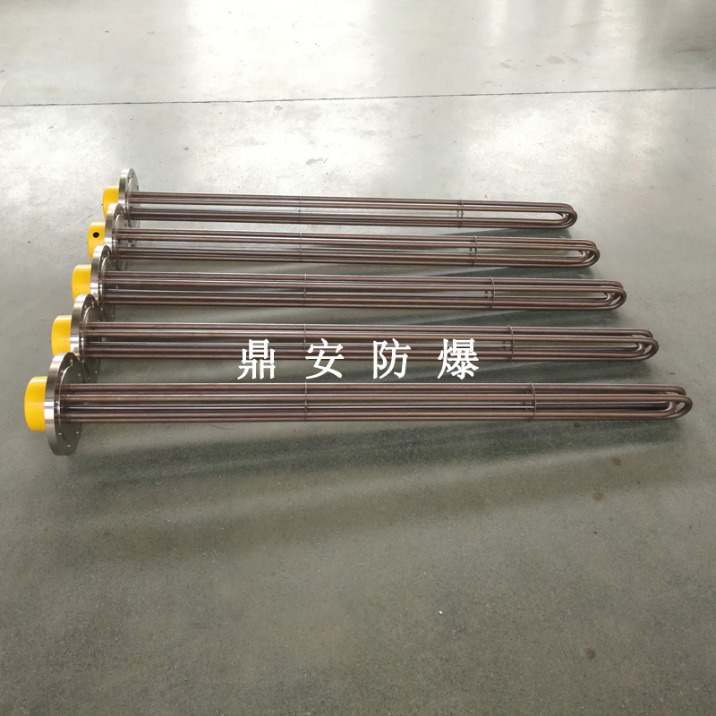 法蘭電熱管(也稱(chēng)插入式電加熱器):是采用U型管狀電熱元件,多支U型電熱管焊接在法蘭上集中加熱,依據(jù)加熱不同介質(zhì)設(shè)計(jì)規(guī)范,按照功率配置要求裝配在法蘭蓋上,插入需加熱物料中,發(fā)熱元件工作時(shí)所發(fā)出的大量熱量傳導(dǎo)給被加熱介質(zhì)使介質(zhì)溫度升高,達(dá)到所需的工藝要求,主要用于敞開(kāi)式、封閉式的溶液箱和循環(huán)系統(tǒng)中加熱用。
