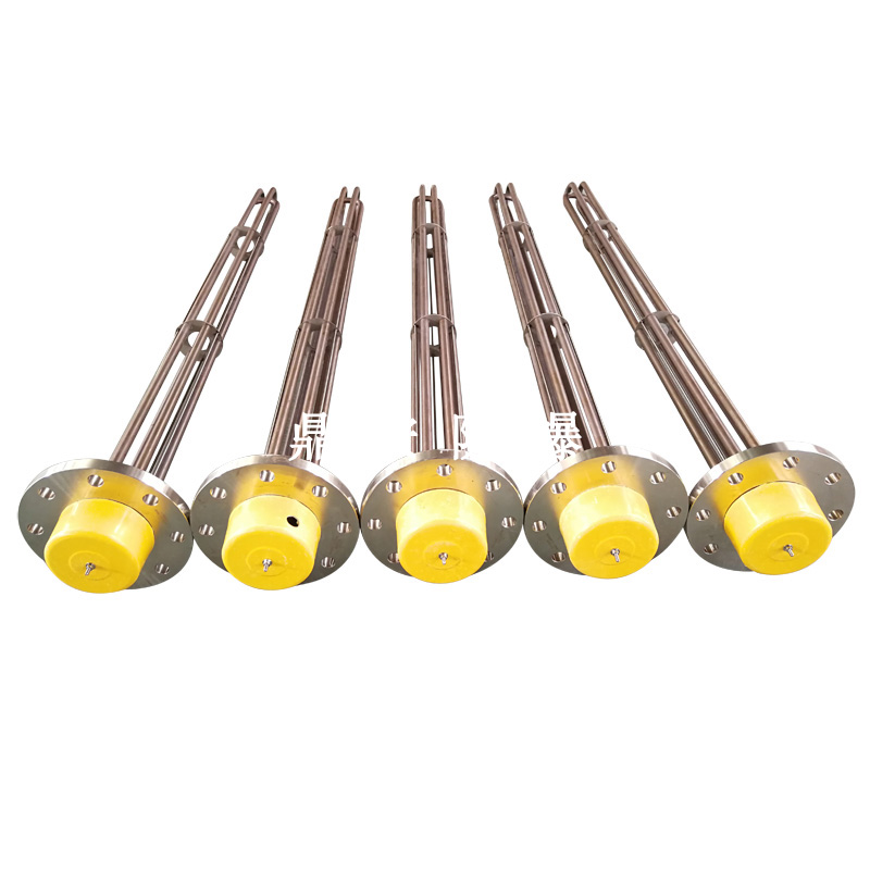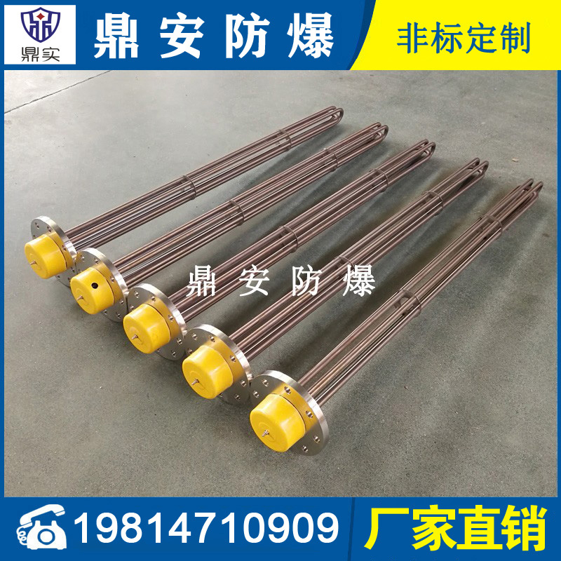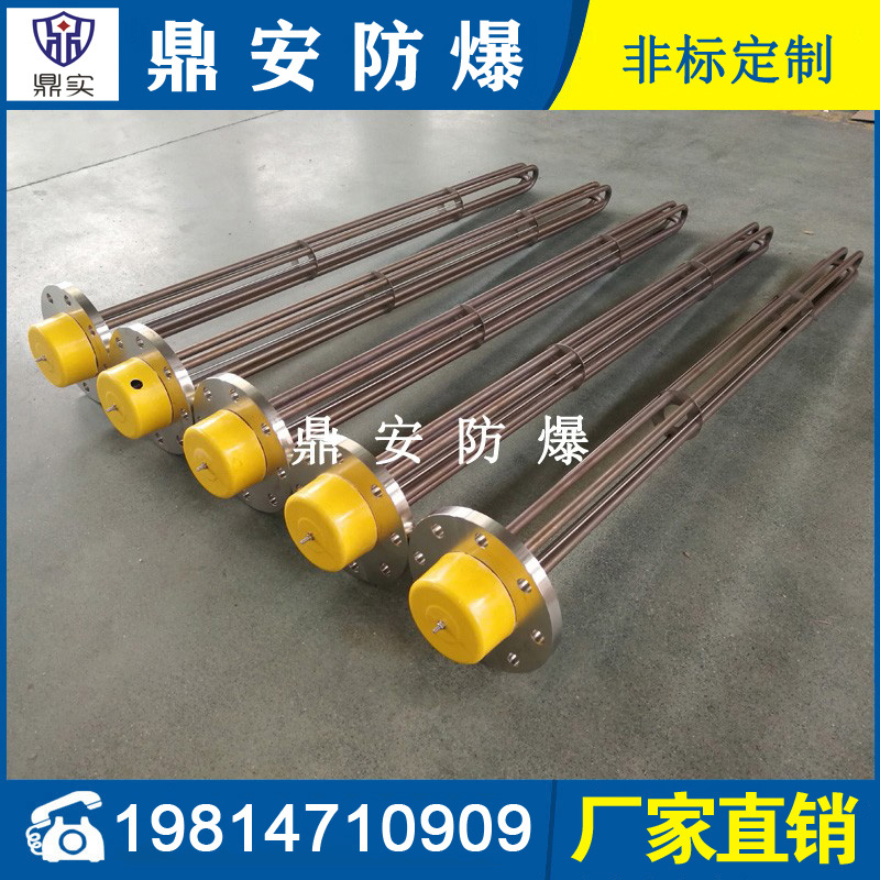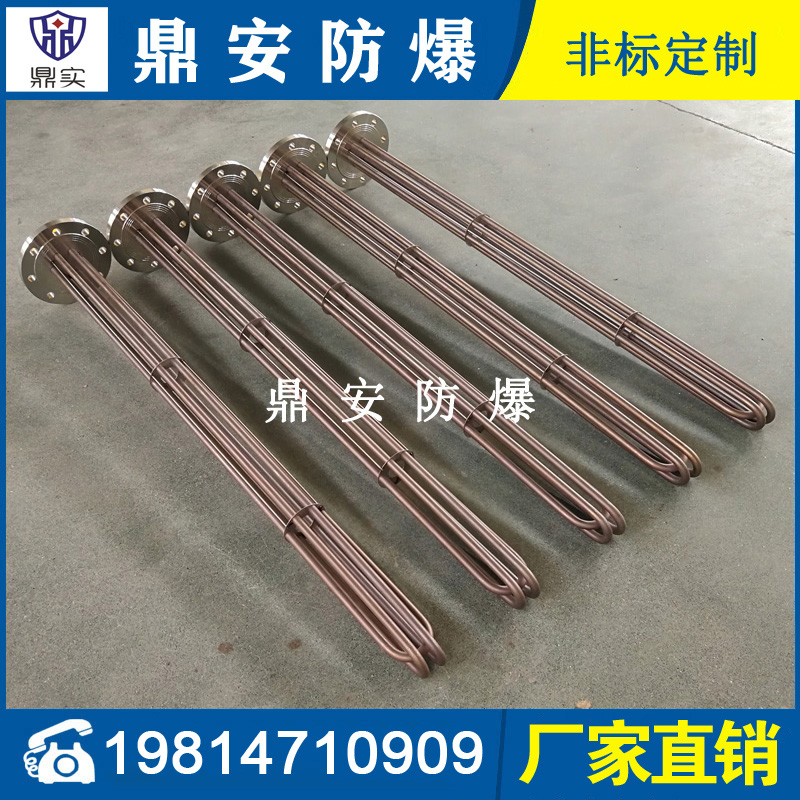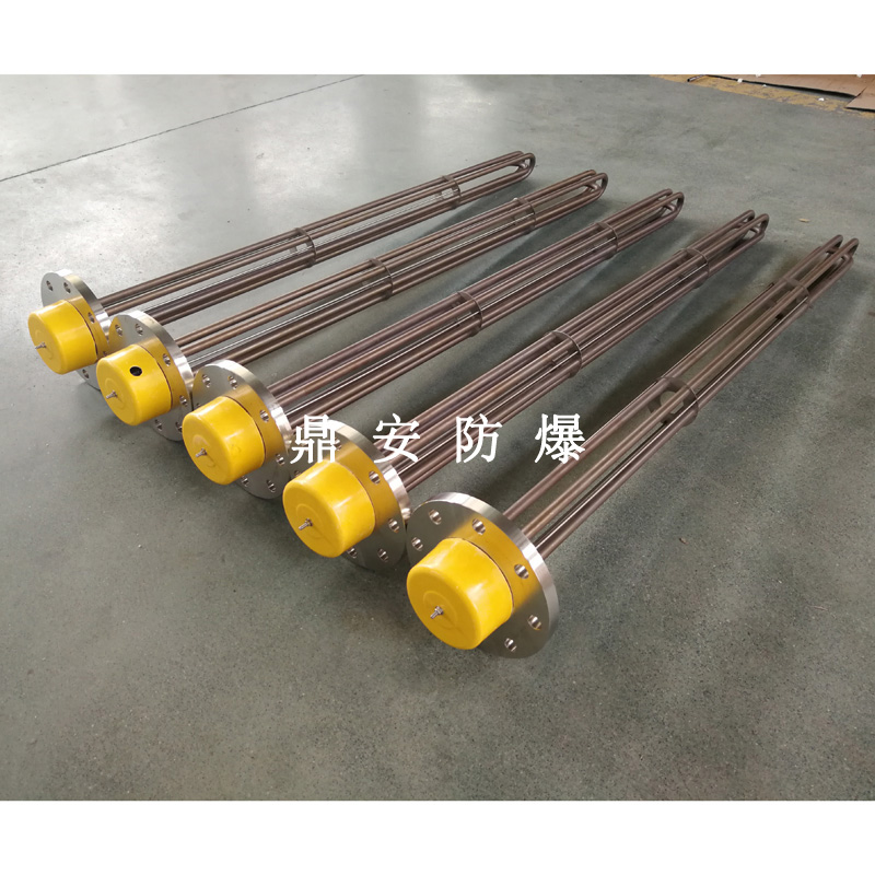 法蘭電熱管(也稱(chēng)插入式電加熱器):是采用U型管狀電熱元件,多支U型電熱管焊接在法蘭上集中加熱,依據(jù)加熱不同介質(zhì)設(shè)計(jì)規(guī)范,按照功率配置要求裝配在法蘭蓋上,插入需加熱物料中,發(fā)熱元件工作時(shí)所發(fā)出的大量熱量傳導(dǎo)給被加熱介質(zhì)使介質(zhì)溫度升高,達(dá)到所需的工藝要求,主要用于敞開(kāi)式、封閉式的溶液箱和循環(huán)系統(tǒng)中加熱用。