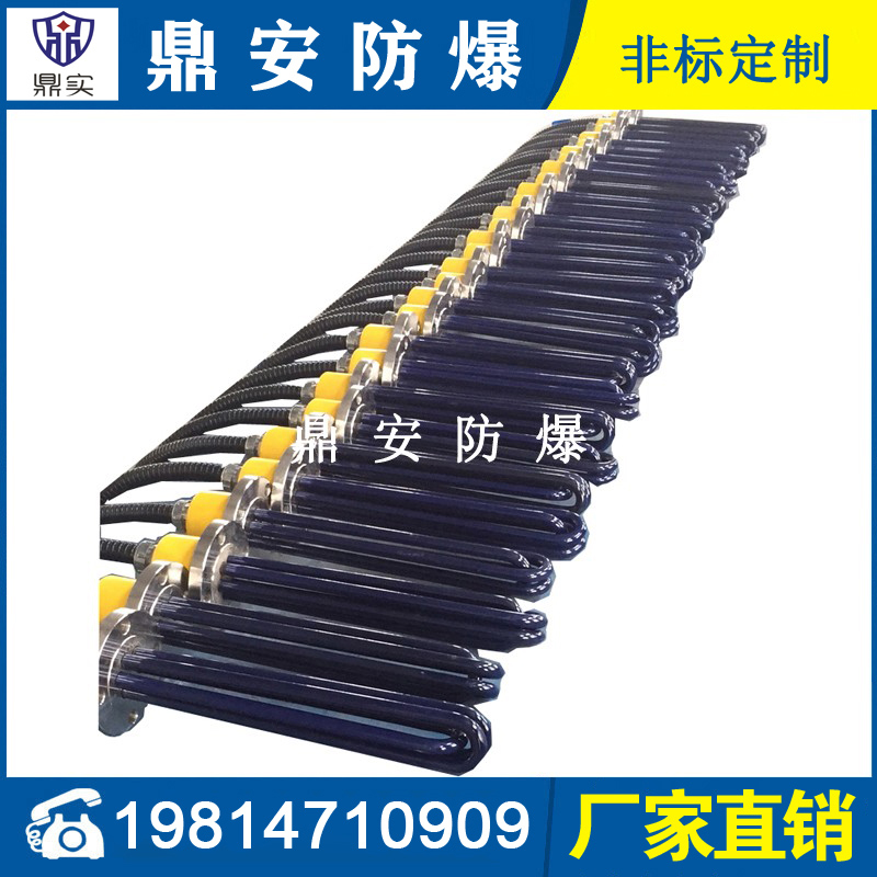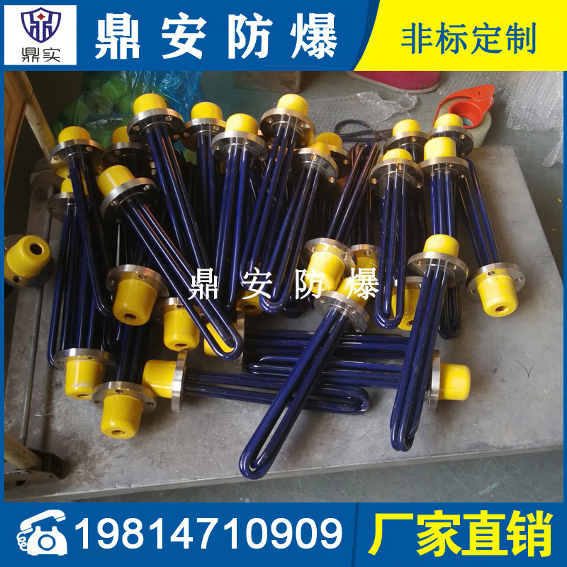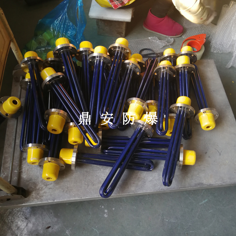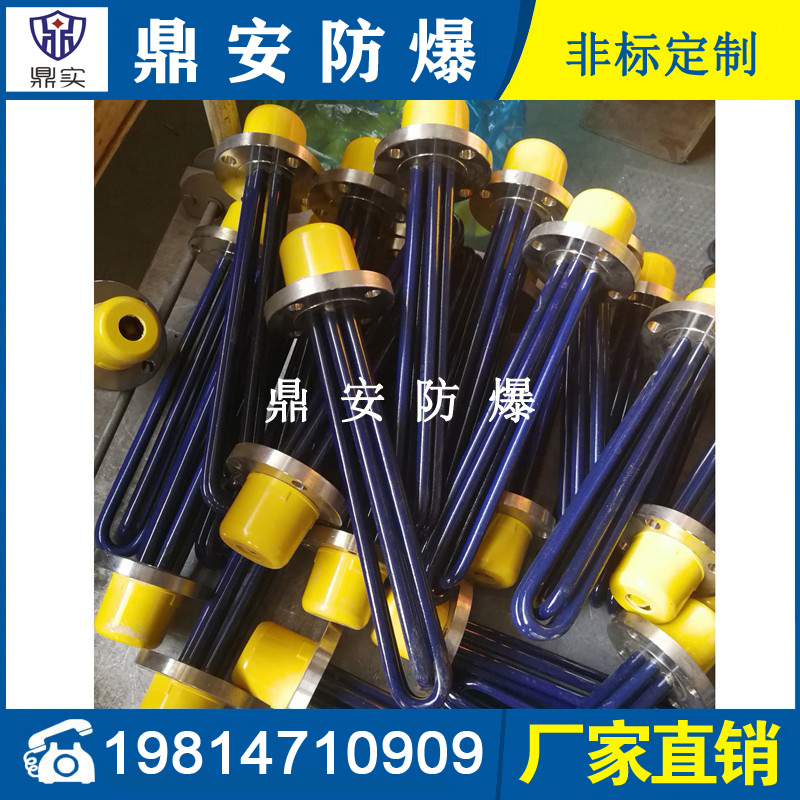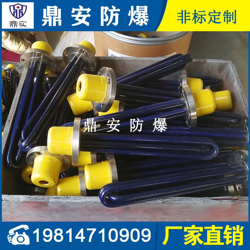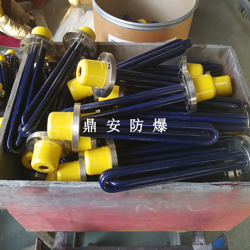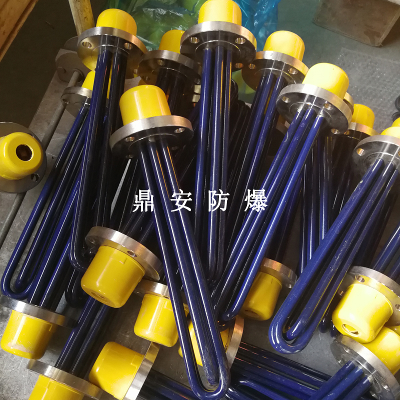 法蘭電熱管(也稱插入式電加熱器):是采用U型管狀電熱元件,多支U型電熱管焊接在法蘭上集中加熱,依據(jù)加熱不同介質設計規(guī)范,按照功率配置要求裝配在法蘭蓋上,插入需加熱物料中,發(fā)熱元件工作時所發(fā)出的大量熱量傳導給被加熱介質使介質溫度升高,達到所需的工藝要求,主要用于敞開式、封閉式的溶液箱和循環(huán)系統(tǒng)中加熱用。