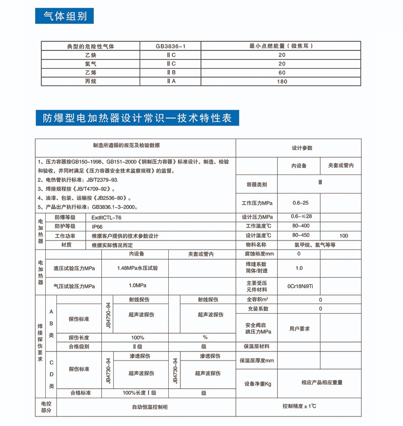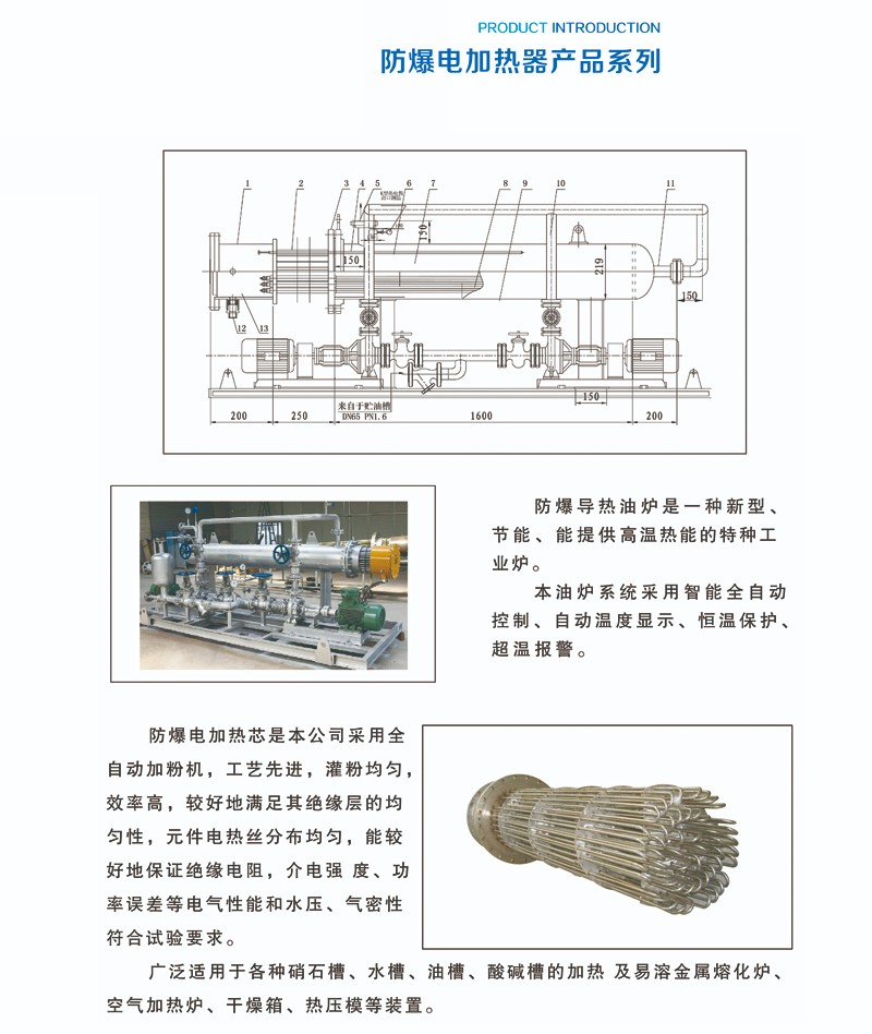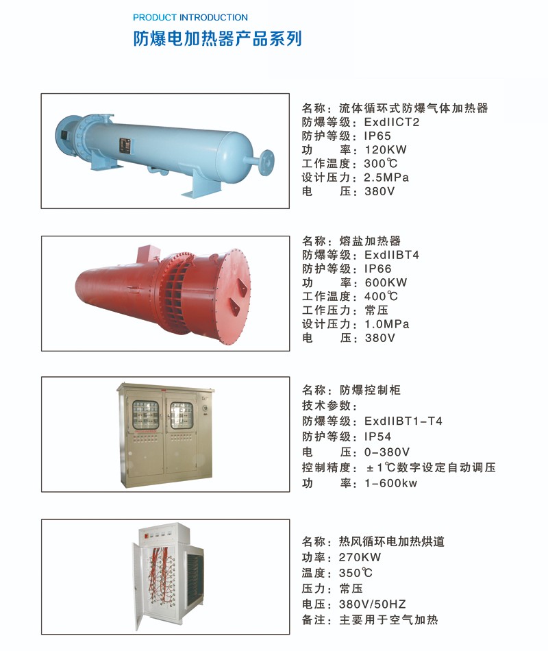 電加熱器,液體防爆電加熱器,防爆型天然氣加熱器,防爆乙炔氣電加熱器,防爆型氫氣電加熱器,防爆型甲醇加熱器,防爆二甲醚電加熱器,防爆導(dǎo)熱油電加熱器(導(dǎo)熱油爐,有機(jī)熱載體系統(tǒng)),防爆原油、重油(燃料油)、稠液電加熱器 ,防爆(普通)貯油罐電加熱器。